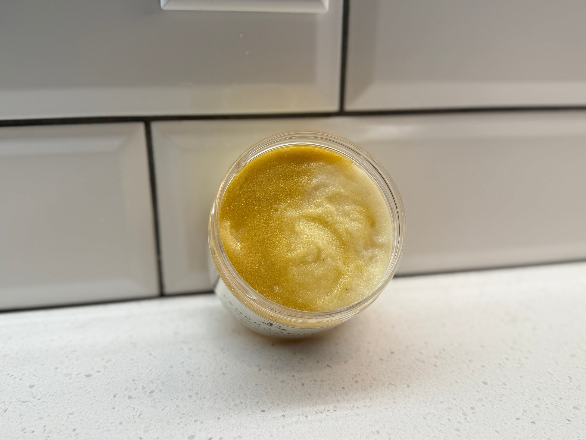 - Take a generous scoop of the foaming sugar scrub, rub into your hand to make it easier to manage and then massage it onto your skin in circular motions.