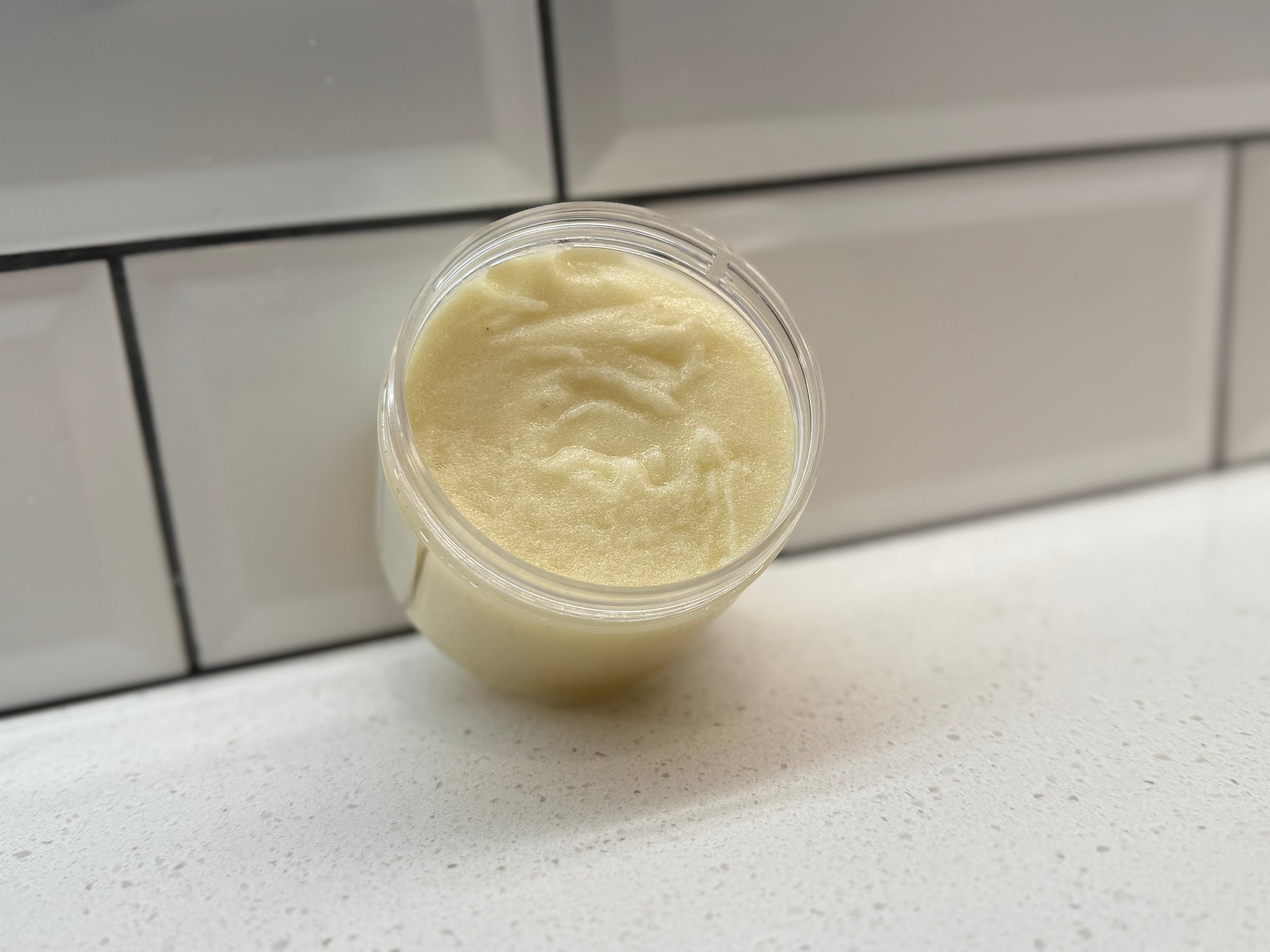 - Take a generous scoop of the foaming sugar scrub, rub into your hand to make it easier to manage and then massage it onto your skin in circular motions.